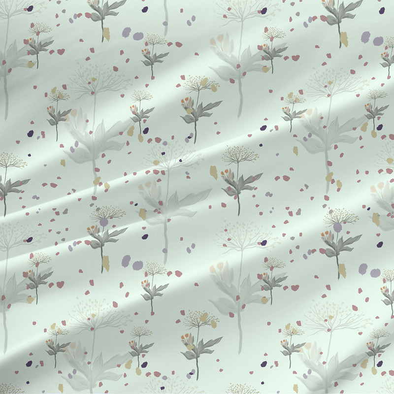 - Pale Sage - A light mint-sage ground with whispery shadows and cool grey stems. Confetti in blush, butter, and violet keeps it fresh and springlike—perfect for nursery makes and table linens.
