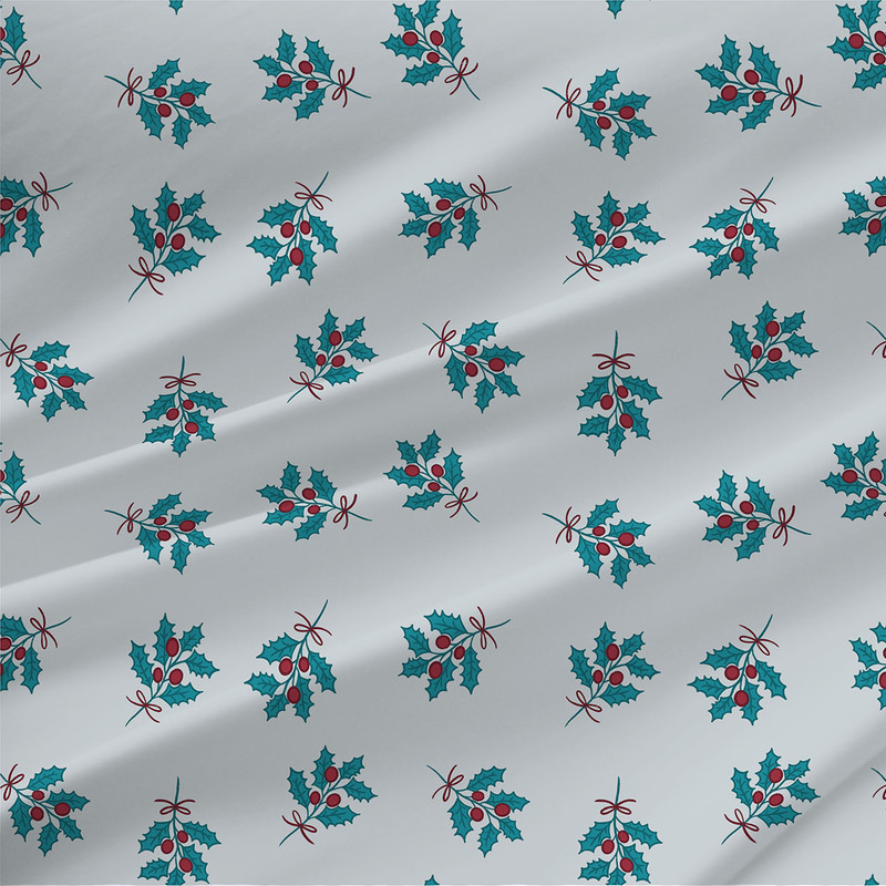 - Cranberry Frost – Pale icy blue ground with teal-pine leaves, bright cranberry red berries, and slim cranberry bows; crisp dark linework for definition.