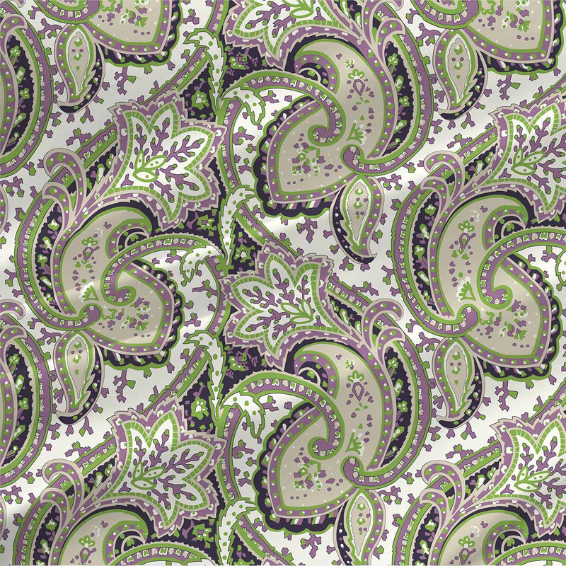 Elegant lilac and green paisley design custom prints by the yard on any base fabric you choose! Our extensive range of high-quality fabrics are perfect for apparel, home decor, quilting and crafts, upholstery, and furniture renovation! Colorway images represent 27" of printed fabric. All print on demand and ship FOB NC. Design from the The Textile District.