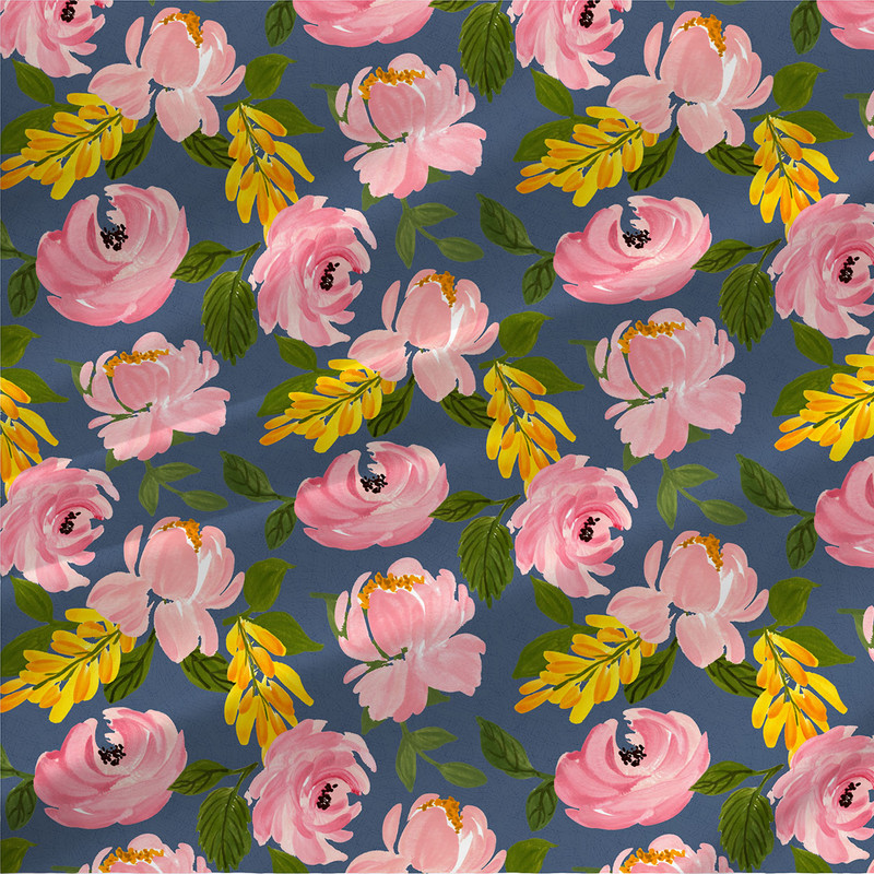 - Coastal Serenity - Soft pink blooms accented with golden yellow blossoms stand out against a slate-blue background. This colorway feels fresh and breezy, ideal for spring apparel, airy quilts, or coastal-inspired decor.