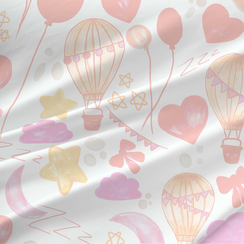 Whimsical air balloons, hearts, and star motifs design custom prints by the yard on any base fabric you choose! Our extensive range of high-quality fabrics are perfect for apparel, home decor, quilting and crafts, upholstery, and furniture renovation! Colorway images represent 27" of printed fabric. All print on demand and ship FOB NC. Design from the “Sweet Dreams” Collection created by SweetbunnyArts.